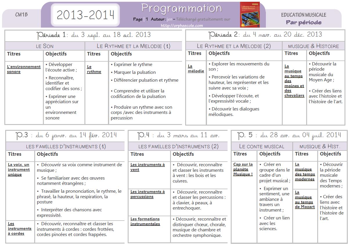 Jen nous envoie sa programmation de musique, divisée par période, à partir de la méthode L’éducation musicale à l’école élémentaire