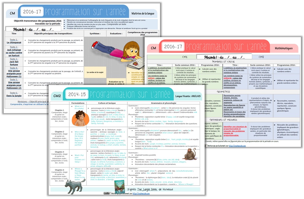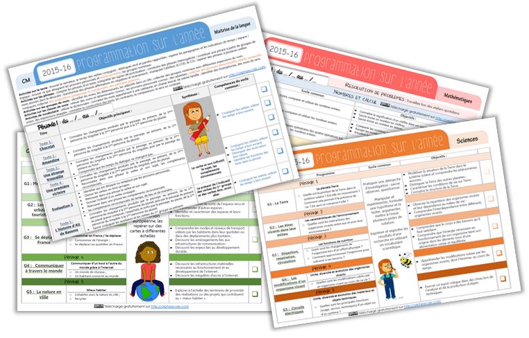 Français (selon la grammaire au jour le jour année 2) (Merci à Soen qui me l’a envoyée), Mathématiques (selon mes plans de travail), Anglais (selon cette méthode), Sciences – Histoire – Géographie (la programmation est la même que celle de l’année 2014-15 car nous avons une programmation spiralaire sur deux années). Word PDF