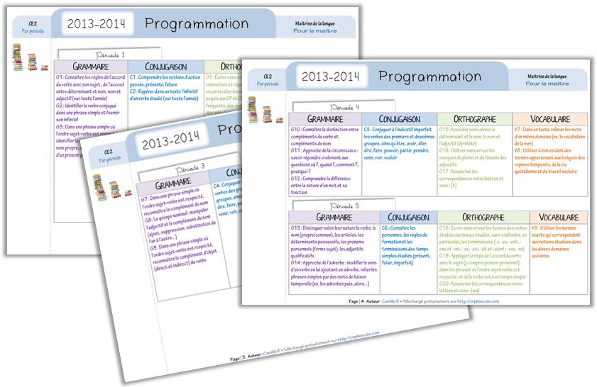Camille R  nous offre sa programmation de français pour les CE2. Elle est libellée sous la forme de compétences (« conjuguer à l’indicatif imparfait les verbes des 1er et 2ème groupes ») et non de notions à travailler (« l’imparfait de l’indicatif »), ce qui est conseillé par les inspecteurs ^^