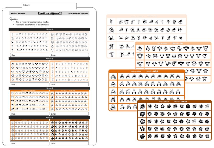 Voici un travail que je viens de terminer pour mes maternelles (plutôt mes M.S. d’ailleurs) sur la recherche de différences et ressemblances d’après un dessin modèle. Ces petites fiches (à plastifier ou mettre sous pochette plastique) sont conçues pour être travaillées en autonomie : l’enfant regarde sur sa feuille de route quelles sont les fiches qui lui restent à faire ; il en choisit une et entoure avec un feutre effaçable tous les dessins identiques au modèle. Lorsqu’il pense avoir terminé correctement sa fiche, il va voir l’enseignant qui valide (ou non) et lorsque c’est juste, il n’a plus qu’à tamponner la date sous la fiche correspondante de sa feuille de route.