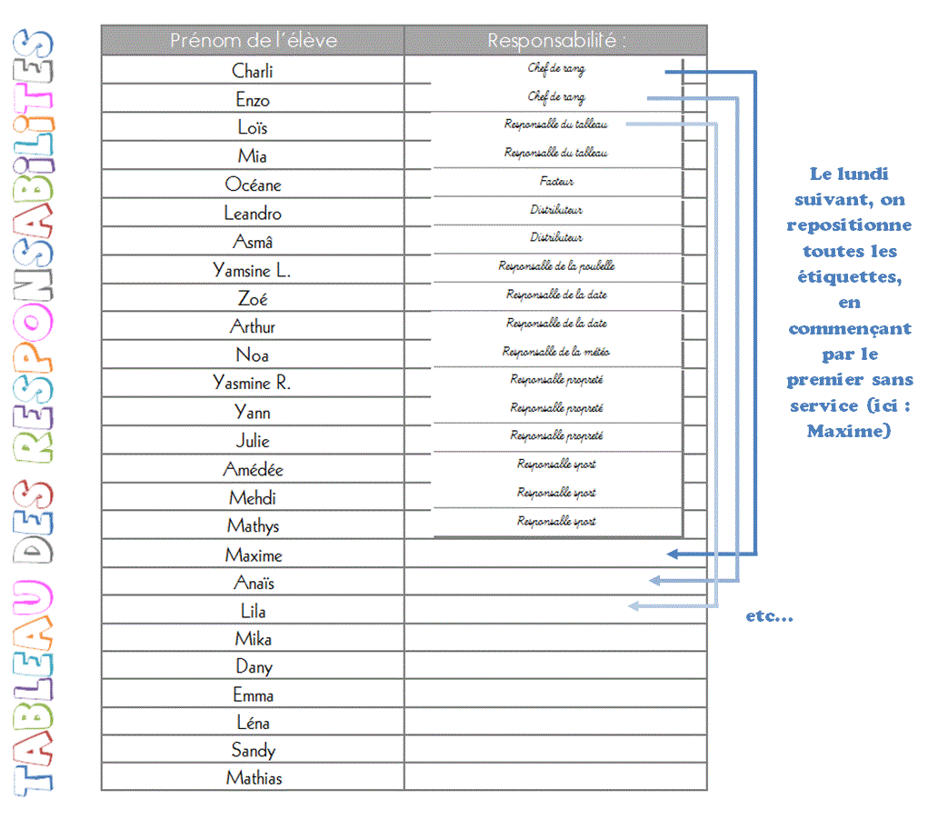 • En face de chaque élève, patafixez une responsabilité (commencez pas le haut)