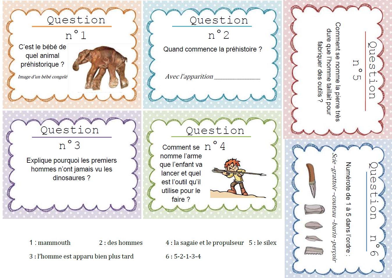 HolaOla(merci à elle !) nous envoie ses 22 cartes questions en histoire pour des CE2 ainsi que les corrections, sur la préhistoire.