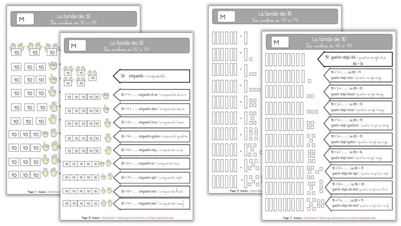 Edit du 23/03/13  : Anne-Claire  m’a envoyé la suite de ses leçons, de la famille du 30 à celle du 90. Un grand merci à elle ! J’aime beaucoup comme elle présente la famille du 70 et du 90, en mettant bien l’accent sur le fait que 72 par exemple c’est aussi bien 70+2 que 60+12, pour améliorer la compréhension. Car, vous vous en êtes bien rendus compte, c’est un calvaire de faire entrer dans leur petite tête ce que représentent ces deux familles de nombres 😀 J’aime la langue française, mais pour une fois, j’aurai aimé qu’elle se calque plus sur nos amis suisses ou belges. Septante et nonante, c’est bien plus parlant ! Voici pour finir ses quelques explications concernant l’utilisation de ses leçons :