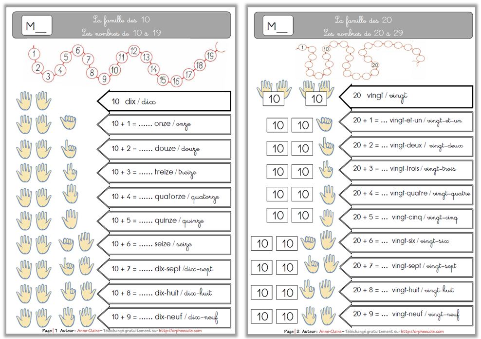 Ce sont deux petites fiches leçons très utiles que je partage avec vous aujourd’hui : l’écriture et la décomposition des nombre de 10 à 19, et des nombres de 20 à 29. C’est Anne-Claire  qui nous les offre, merci beaucoup à elle 🙂