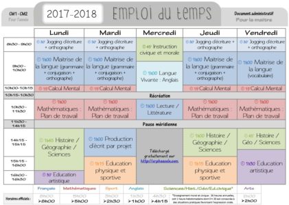 Ayé, c’est parti pour le premier article réservé au CM2 et donc à la rentrée prochaine ! Pour commencer, quoi de mieux que l’emploi du temps pour se donner une idée des différents créneaux horaires. Comme vous le verrez, je n’ai pas réussi à tout faire rentrer (comme d’hab), mais j’espère que ça pourra vous aider un peu à construire le vôtre.