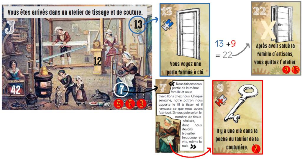 Dans l’exemple ci-dessous, les élèves ont la grande carte de départ. Parmi les numéros à chercher, le 13 représente une porte (morceau de puzzle bleu), et la 7 offre une discussion avec la tisseuse. Sur son tablier, le numéro 9 est caché : il propose le deuxième morceau de puzzle rouge, à combiner : la clé + la porte donnent le numéro 22, qui vous fait quitter la pièce, en allant chercher la carte X.