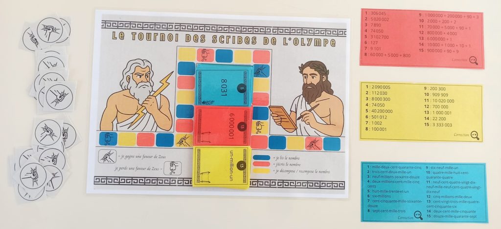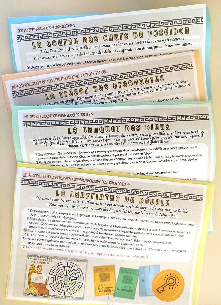 Afin de bien asseoir les compétences de numération, j’ai donc créé des jeux pouvant être joués à 8, sur le thème de la mythologie grecque parce que vous savez, je ne peux pas m’en empêcher 😅. J’ai fait en sorte que le matériel soit simple et que tout tienne dans des pochettes de ce type, que je rangerai dans des classeurs. Voici la description des jeux !