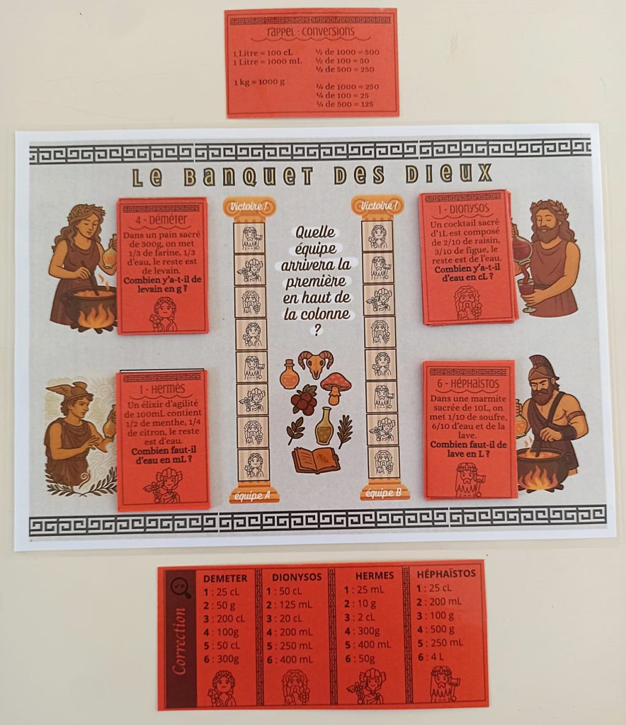 Chaque équipe doit aider Hestia, déesse du foyer, à préparer des offrandes complètes à déposer sur l’autel du temple. Pour cela, les élèves gagnent des parts fractionnées d’aliments sacrés en résolvant des énigmes.