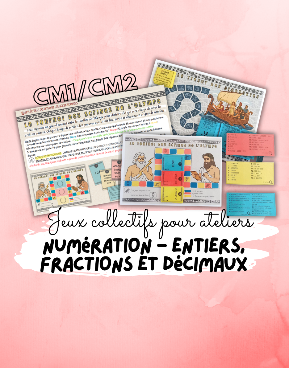 Afin de bien asseoir les compétences de numération, j’ai donc créé des jeux pouvant être joués à 8, sur le thème de la mythologie grecque parce que vous savez, je ne peux pas m’en empêcher 😅. J’ai fait en sorte que le matériel soit simple et que tout tienne dans des pochettes de ce type, que je rangerai dans des classeurs. Voici la description des jeux !